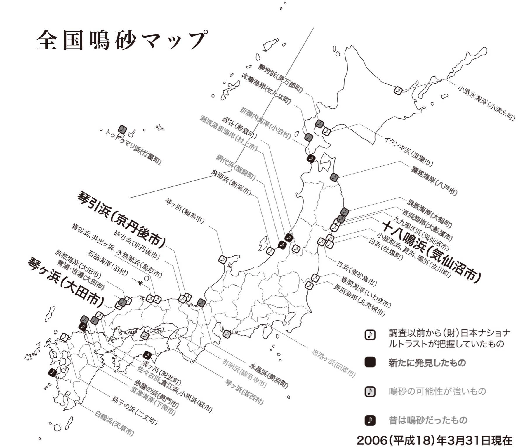 私たちがおこなった鳴砂の全国調査では、北は北海道から南は沖縄八重山諸島まで、30以上の鳴砂の存在が確認されました。しかしかつては、さらに多くの海岸が鳴砂であったと言われています。