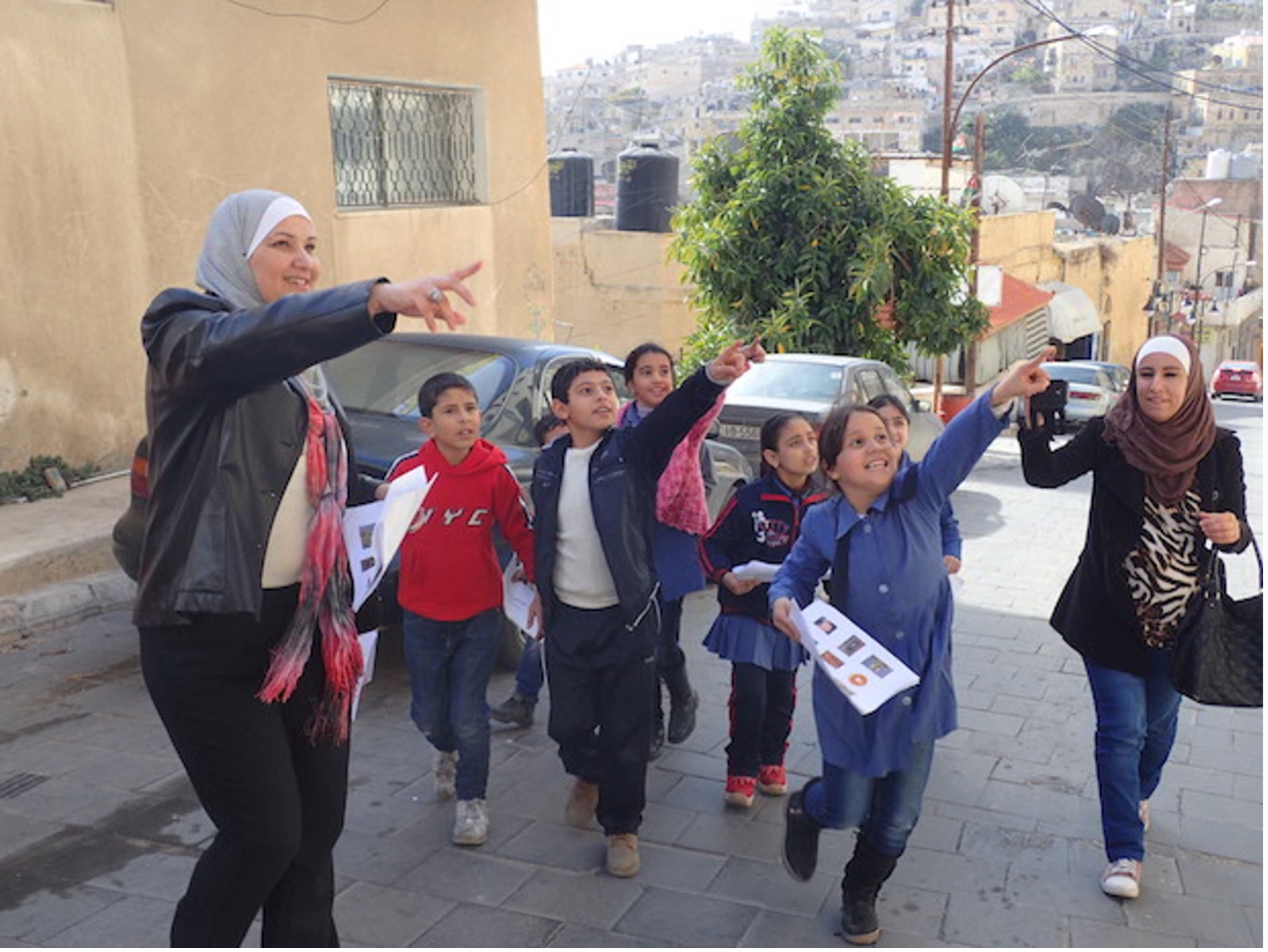 まず、谷底には水の湧き出すアインプラザを中心にスーク(市場)や広場が、丘の麓には邸宅群が建設されるなど、新たな中心市街地が集中的に整備された。一方、農家が並んでいた市街地後背では、丘の斜面を水平に幾重にも走る通りを縦に結ぶ階段や小広場が随所に設けられ、その間隙を埋めるように建物が挿入されることで立体的で高密な斜面市街地が形成された。こうした伝統とモダンを融合させたサルティデザインがもたらす意匠や、異なる建築様式がレイヤー化された建築群が斜面に積み上がりながら他に類を見ない都市景観美が生み出されました。さらに都市を構成する建築群の石材は、いずれも世界的に類例の少ないイエローライムストーンが用いられています。それら黄金色に輝く建物群が3つの丘に挟まれた谷の斜面に立体的に展開し、沸き出る雲のように建ち並ぶ様は壮観です。